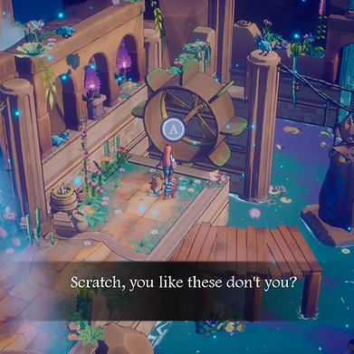 a young girl exploring celestial ruins with the help of her pet companions